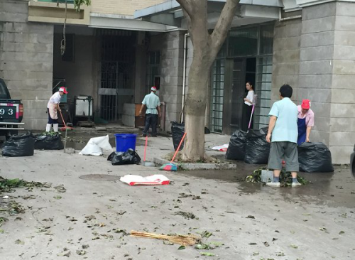 15号当天,几乎所有员工在6:00都准时到位。他们一边着手整理环境恢复工作秩序,一边准备台风过后的第一顿早餐。台风过后,各食堂每夜照常有员工值班。玻璃门被吹坏了还未修复,值班人员将被褥搬到门附近,夜里就睡在门口,守着食堂。女管理员苏秀萍的丈夫不在家,孩子没人照顾,她将孩子锁在屋里,仍然来到食堂值班。柯孙信主任说:“我们后勤人的服务意识和奉献精神真的很赞! (吴佳欣)