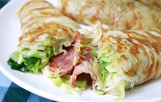 手抓饼:来自于台湾的这道小吃风靡全国,做法各异,在万人食堂一楼由师傅们做出了新花样。培根过水烫去多余盐分,裹上一层浓稠的蛋液,下锅文火细煎至培根出油。将卷心菜洗净切碎入锅,用培根滤出的香油大火开煎,这样烹制的卷心菜能够长时间保持翠绿的色泽。面饼摊开烙得金黄,趁热裹起包菜、培根片,撒上少许胡椒粒即可端出销售。新鲜出炉的手抓饼千层百叠,层如薄纸,用手抓之,其外层金黄酥脆,内层柔软白嫩,培根粉嫩,鲜蔬如翡翠,一股面筋的香气夹着肉香油香扑鼻而来,让人保持不住,抓起就吃。