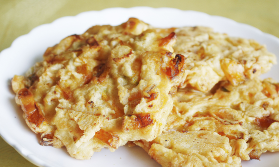 南瓜煎饼:水产学院九餐三楼中午独有的南瓜饼,可遇不可求。南瓜削皮切成匀称细条,放入盐、白糖腌制入味,接着挂上由生粉、地瓜粉和面粉混合搅拌成的面糊,团成圆饼状,下锅煎炸至漂亮的金黄色,此时酥软的南瓜条夹在鹅黄色的煎饼中,轻轻咬开,香气四溢。创意地将三种粉结合是南瓜饼美味的秘诀,生粉的黏、地瓜粉的Q,以及面粉的酥搭配默契,入口略微发脆,细嚼香甜软嫩,馅料饱满,分量十足,一切都恰到好处。
